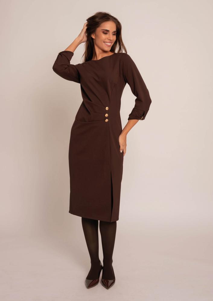 Burgundy Magenta dress made of mixed fibers, slim fit, decorated with pleats and decorative buttons at the waist, slit sleeves with twisted decoration at the bottom, zipper closure at the back.