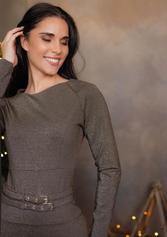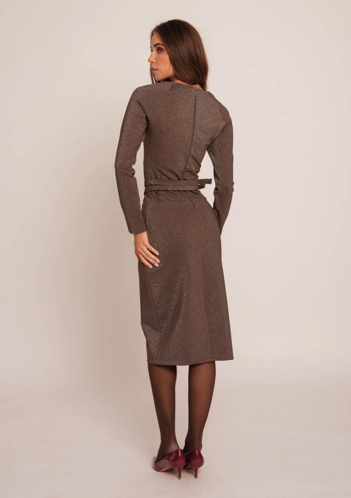 Brown, elastic, shiny punto Magenta dress, slim fit, double belt, zip closure on the back. Metal Magenta branding sewn on the sleeve.