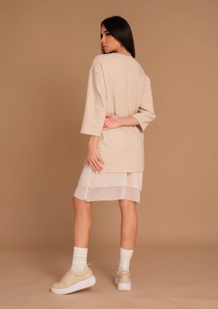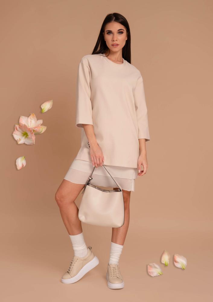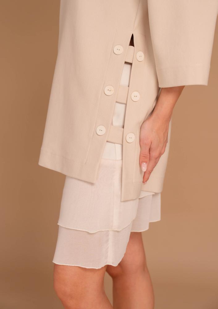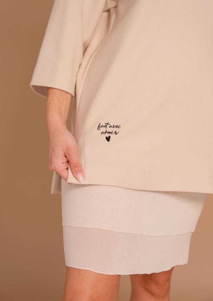 Butter colored Magenta tunic, loose fit, round neckline, 3/4 sleeves, decorated with buttons on the side. Embroidered Magenta branding on the front.