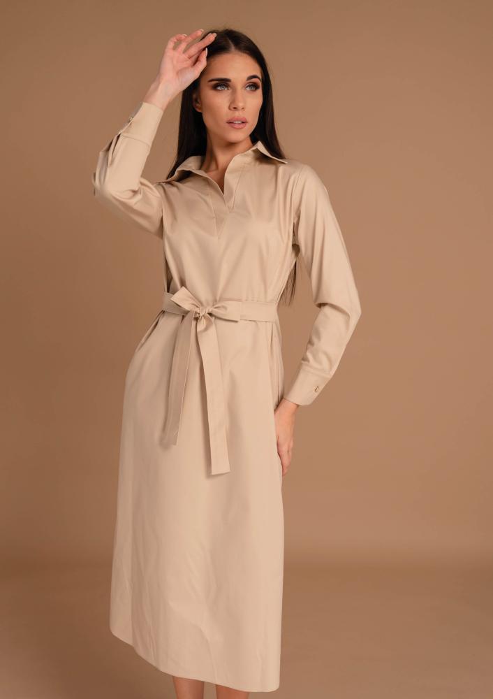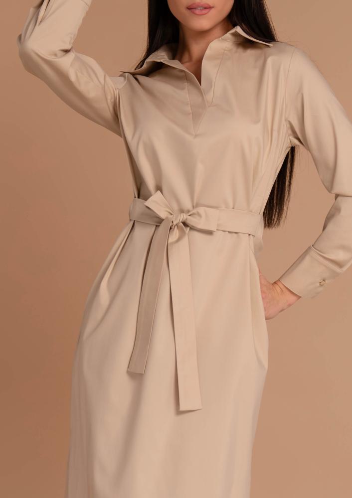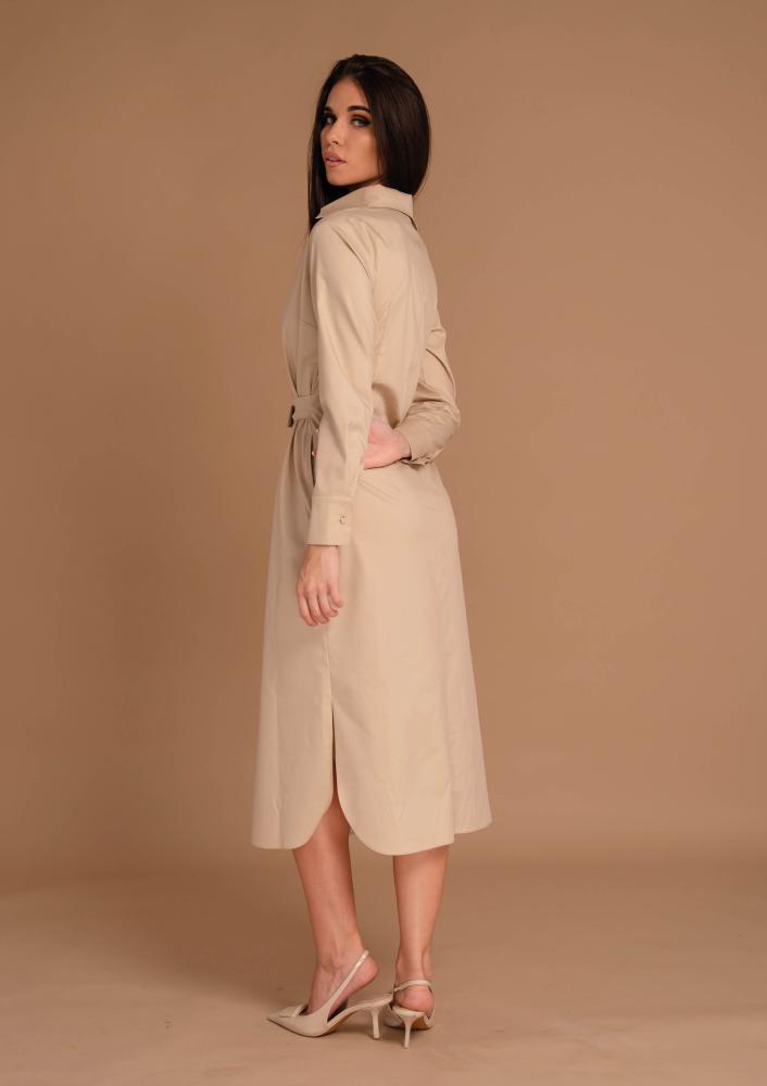 Beige, linen-effect Magenta dress with collar, self-fabric tie at waist, pockets. Metal Magenta branding sewn on the side.