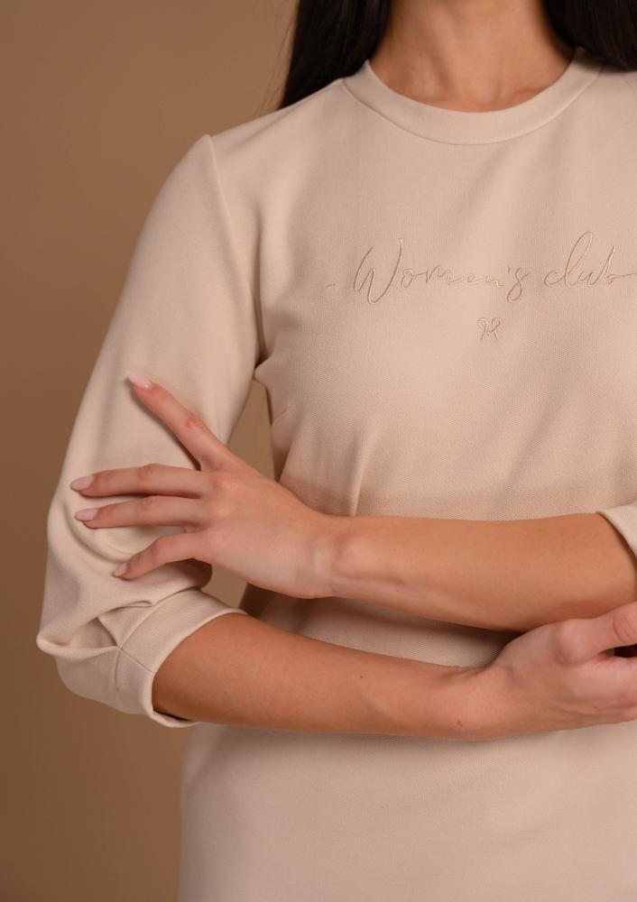 Beige Magenta tunic, loose fit, round neckline, pockets, knee length. Embroidered Magenta branding on the front.