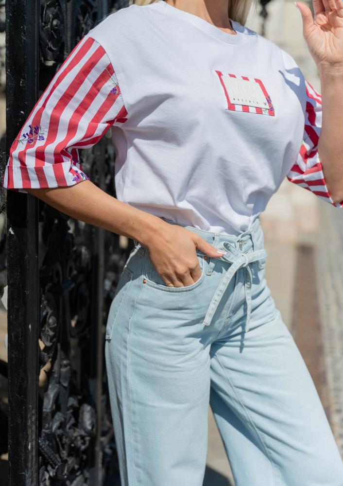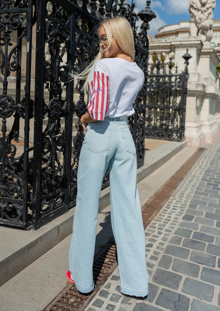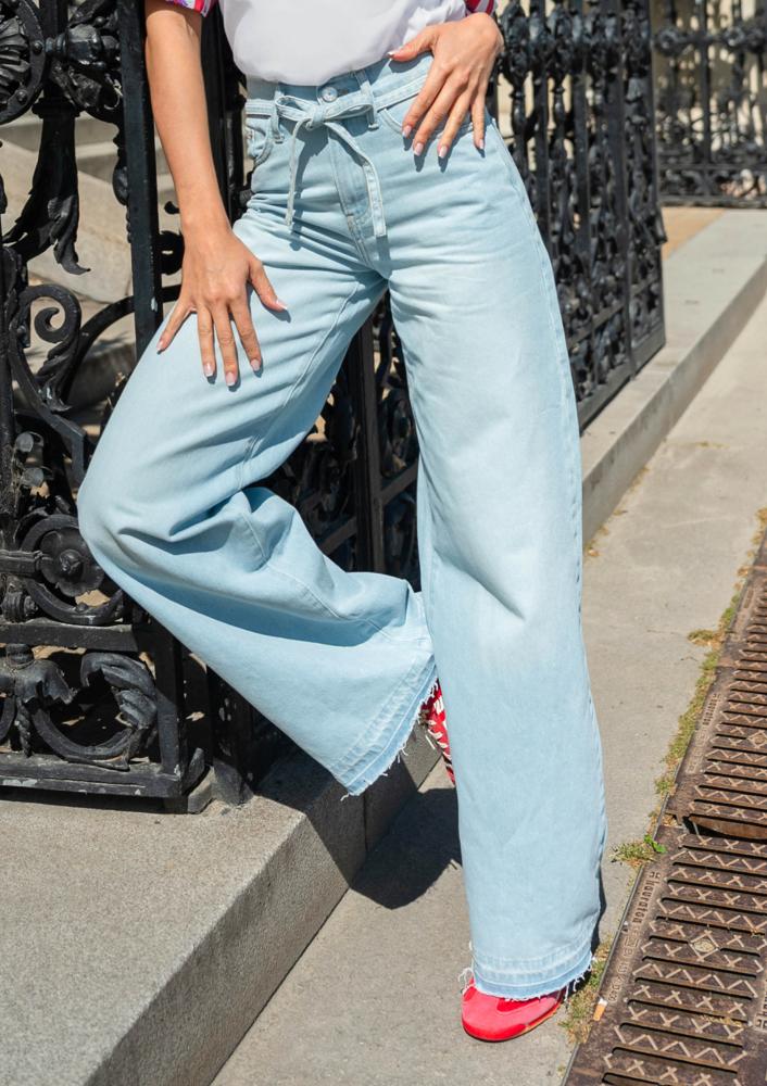 Light blue, Magenta denim pants, loose fit, front button and zip closure, waistband with belt loops and drawstring, pockets. Magenta branding sewn on the back.