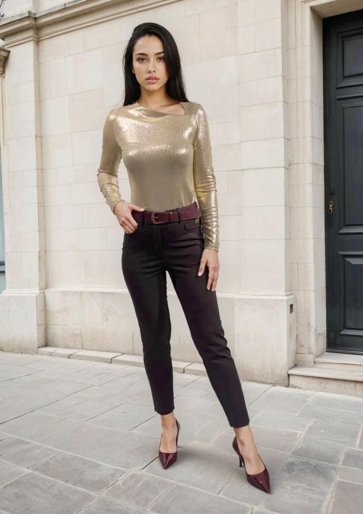 Light blue, elastic punto Magenta trousers, ironed, wide leg, with pockets, button and zip closure at the front, belt tuck waist. Metal Magenta branding sewn on the front.