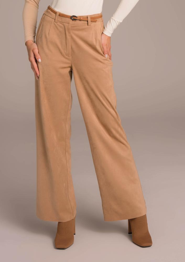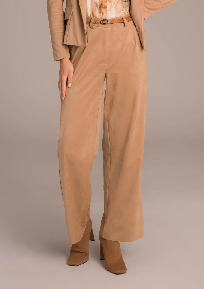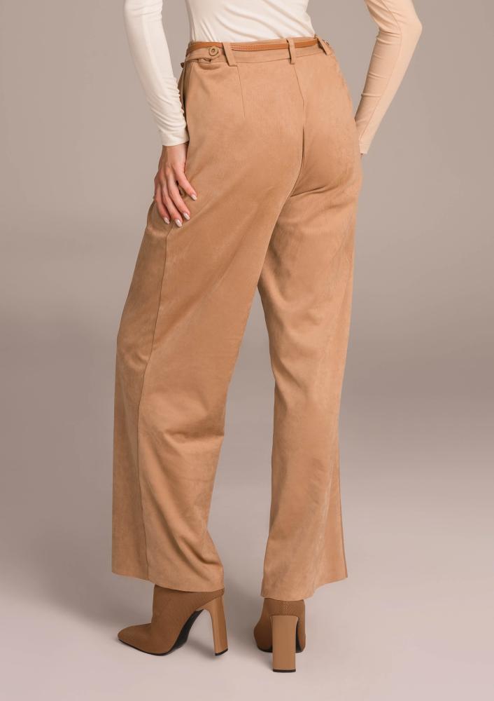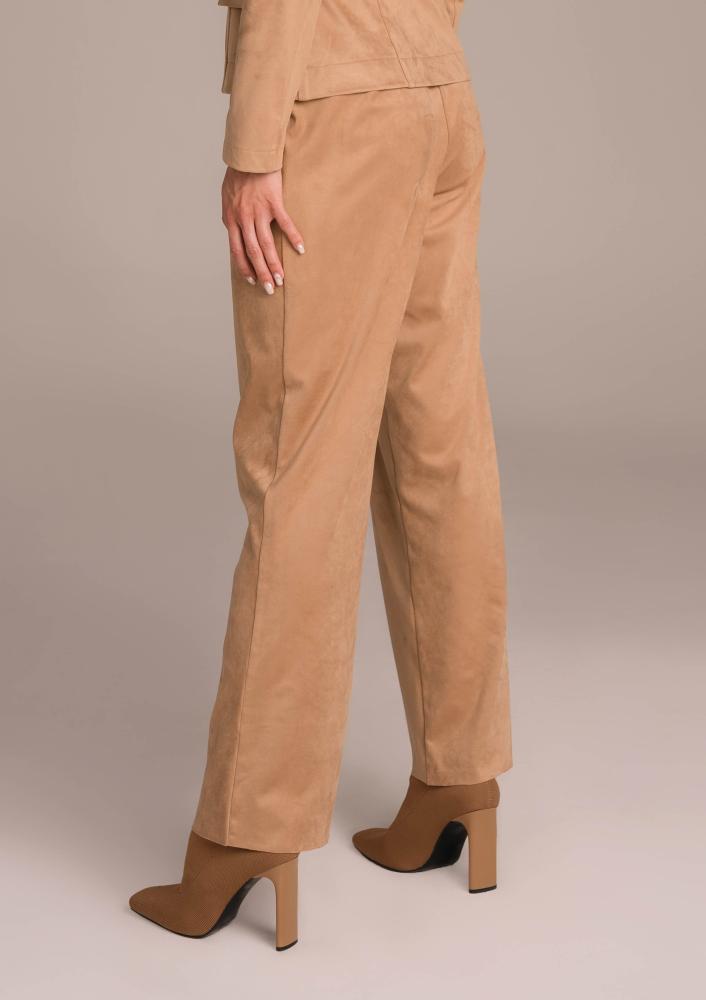 Brown suede Magenta pants, looser, straight leg, button and zip closure at the front, belt loops at the waist, pockets. Textile Magenta branding sewn on the side.