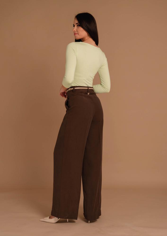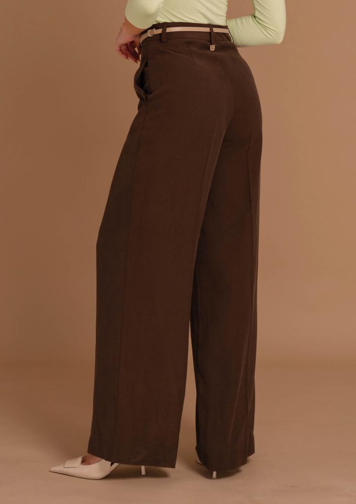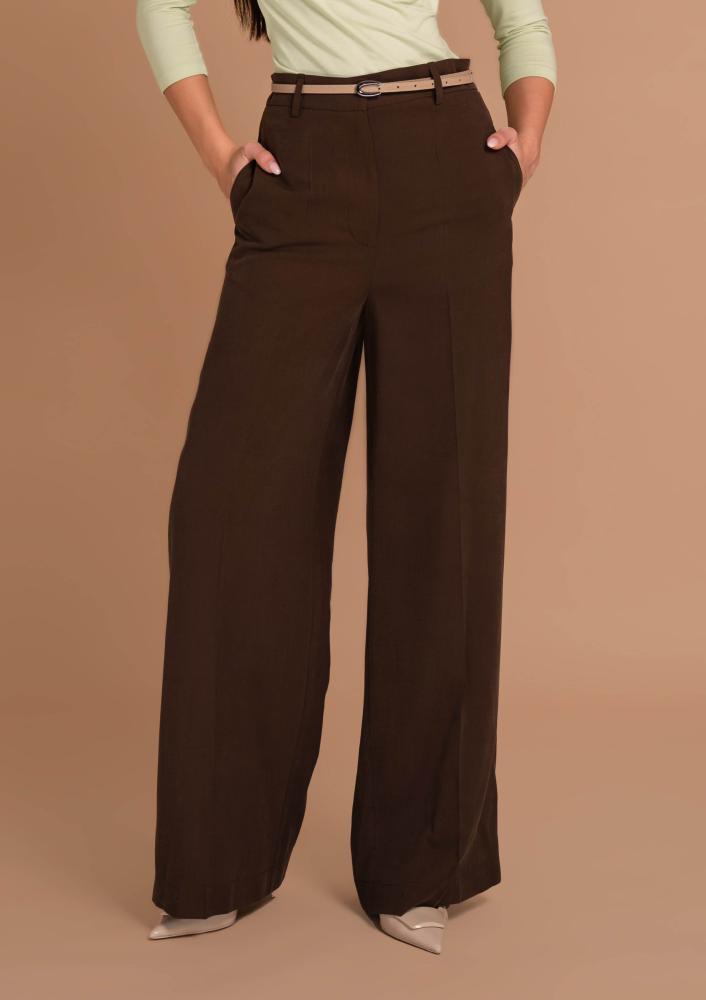Brown, linen-effect Magenta trousers with a wider leg, button and zip fastening at the front, belt loops at the waist, pockets. Metal Magenta branding sewn on the back.