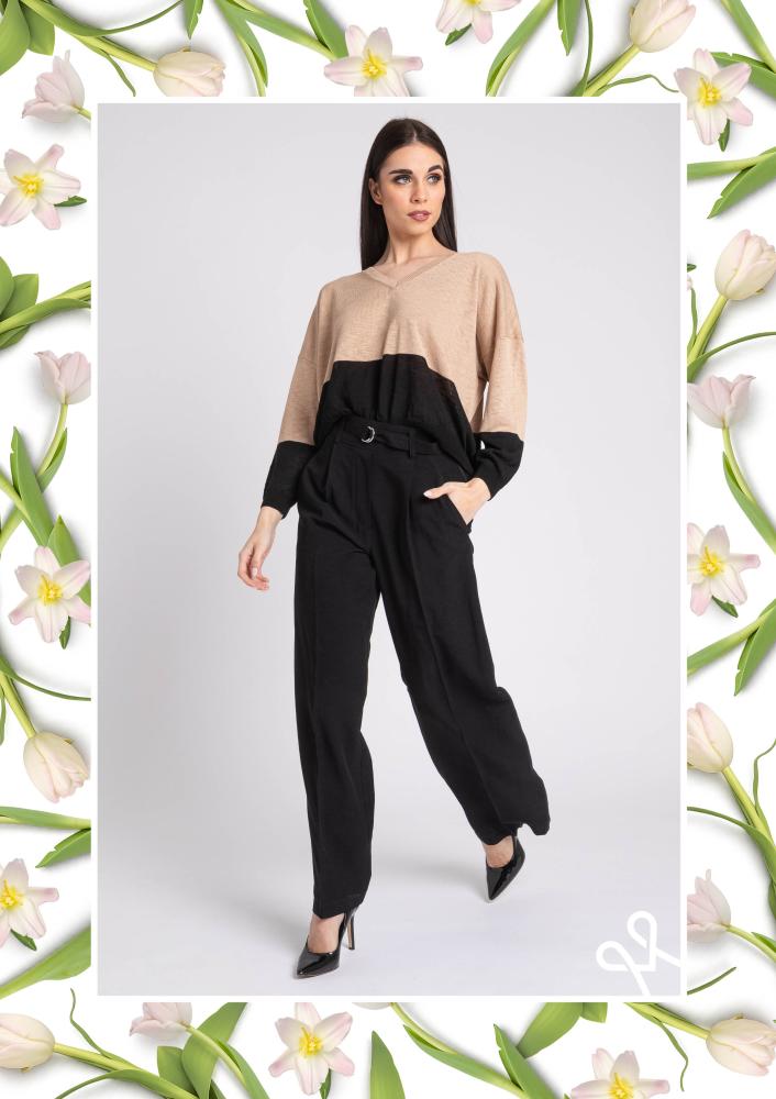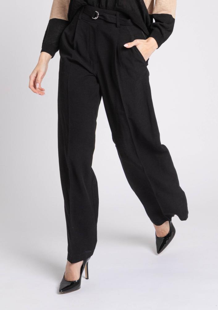 Black, linen Magenta trousers, straight leg, ironed edges, side zip closure, drawstring waist, pockets. Magenta brand logo sewn on the front.
