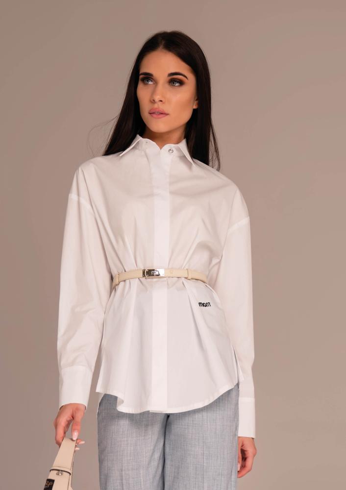 White cotton-linen Magenta shirt, loose fit, with hidden button closure at the front, wide button cuffs. Embroidered Magenta brand logo at the front.
