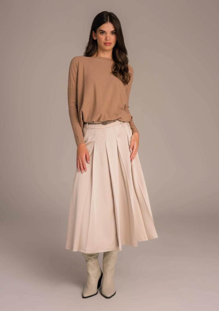 Butter colored, mixed fiber Magenta pleated skirt, looser fit, zip closure, belt loop waist. Sewn textile Magenta branding on the side.