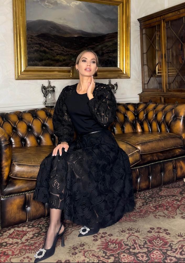 Black, lined tulle Magenta skirt, A-line, with faux leather on the waist, zip closure on the back. Sewn-on textile Magenta branding on the side.
