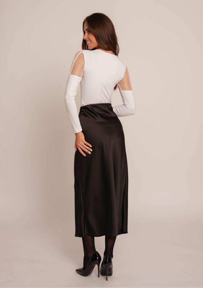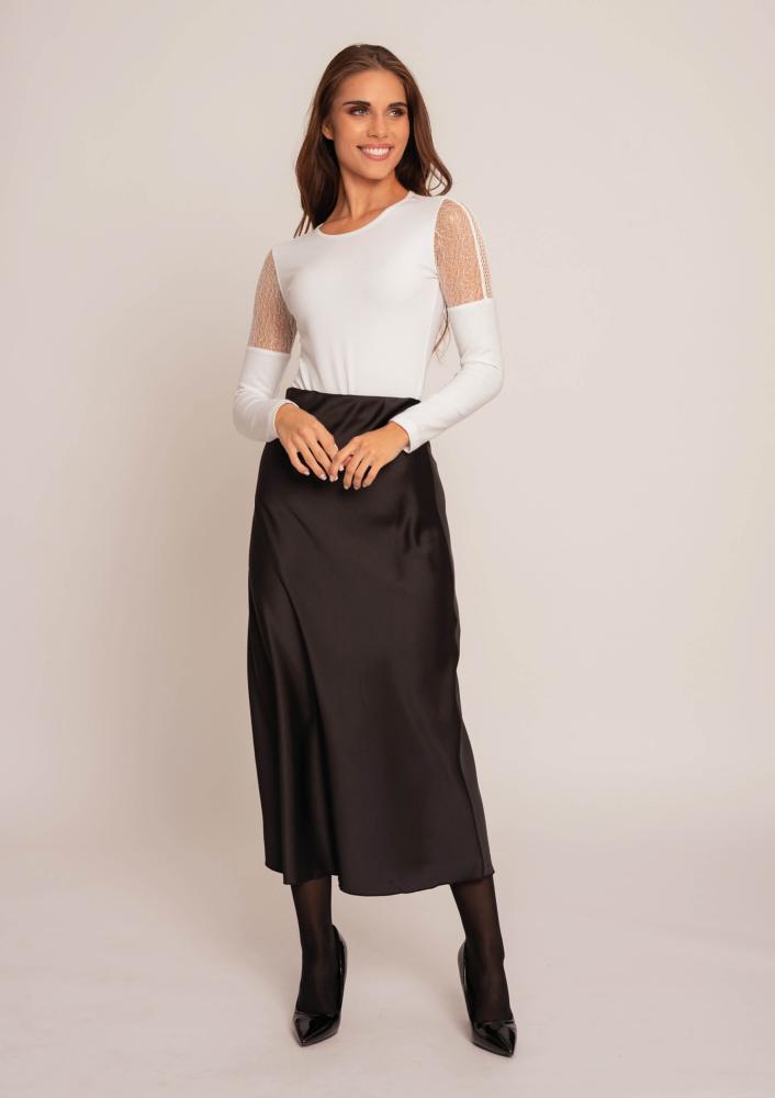 Black satin Magenta midi skirt, straight cut, elasticated waist. Magenta branding sewn on the side.