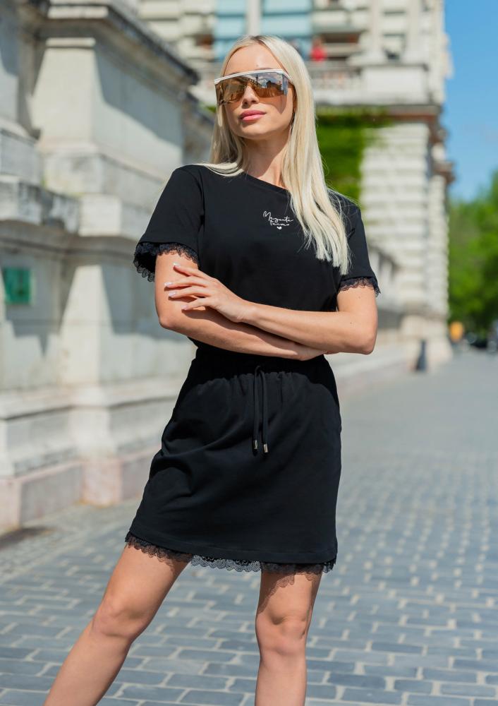 Black cotton Magenta skirt with elastic waistband and tie, pockets, above-knee length, lace trim at the bottom. Textile Magenta branding sewn on the side.