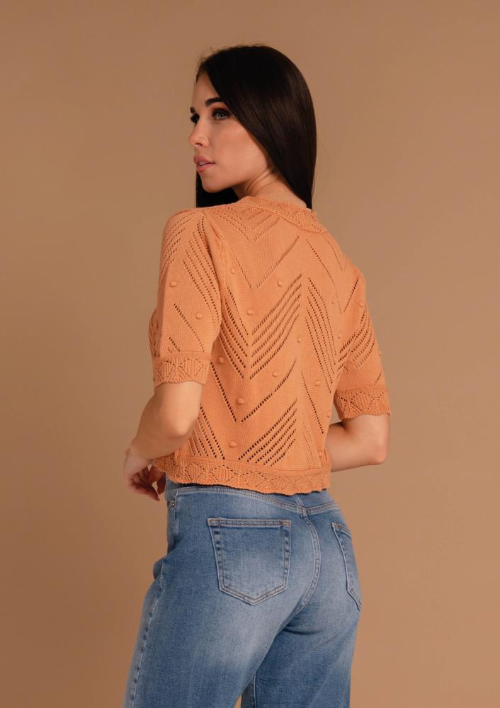 Sand brown, elastic knit Magenta cardigan, loose fit, button closure at front, short sleeves. Metal Magenta branding sewn on sleeve.