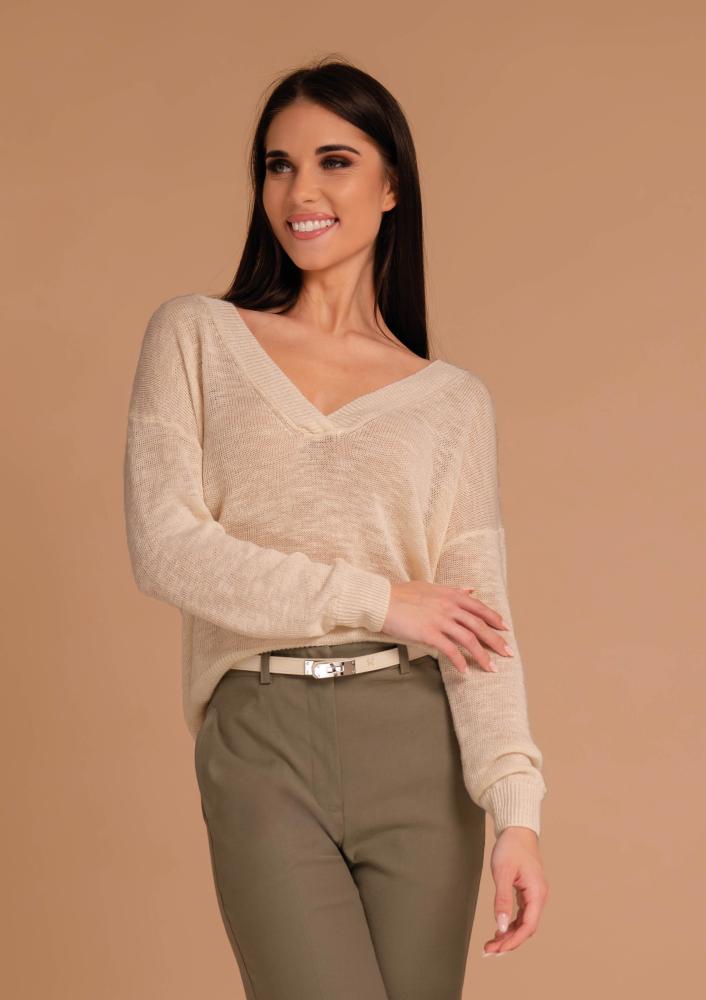 Beige, elastic knit Magenta top, loose fit, V-neck, long sleeves.