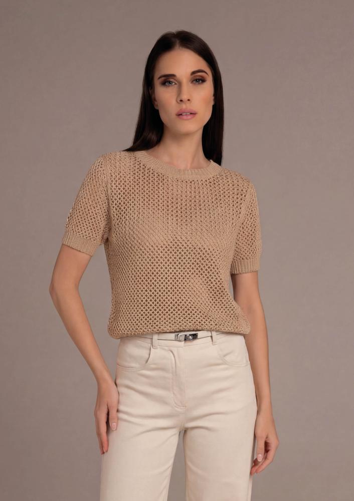 Brown, elastic Magenta knitted top, loose fit, round neckline, short sleeves. Magenta brand logo sewn on the sleeve.