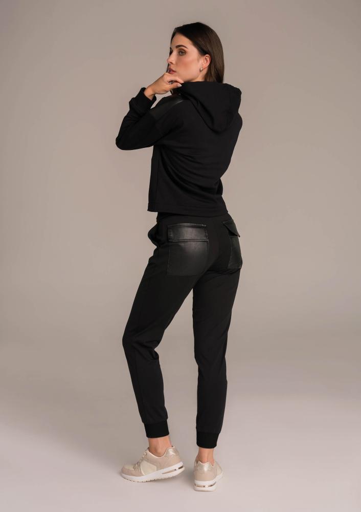 Black, sporty Magenta top, loose fit, hood and drawstring, leather inserts on the shoulders. Film-printed Magenta branding on the back.