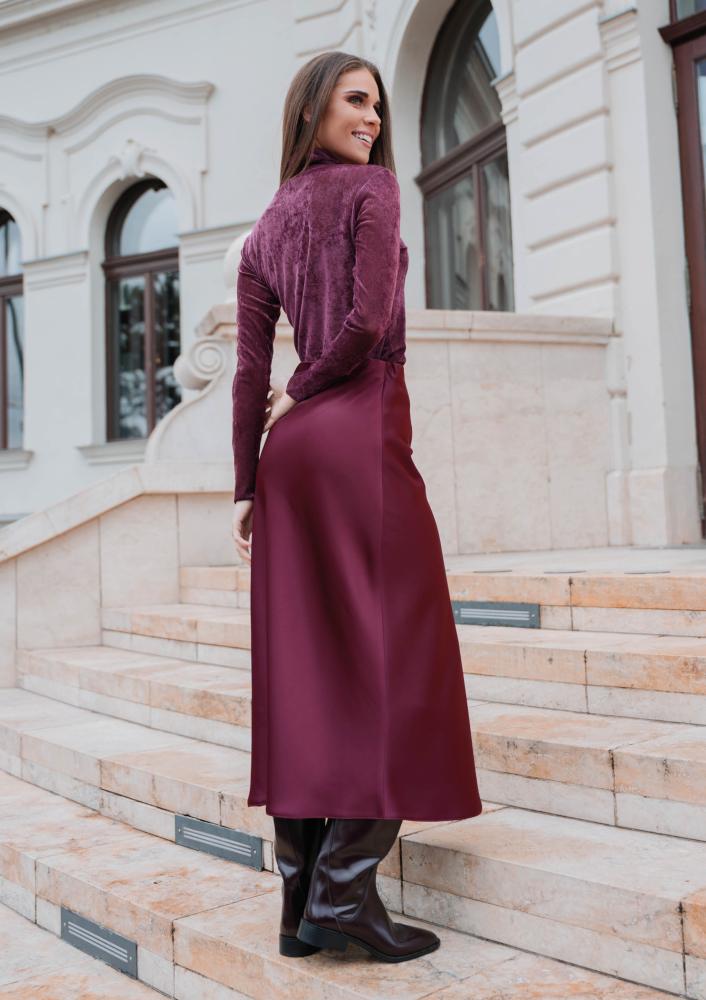 Burgundy, blended Magenta top with turtleneck, slightly sheer. Metal Magenta branding sewn on the back.
