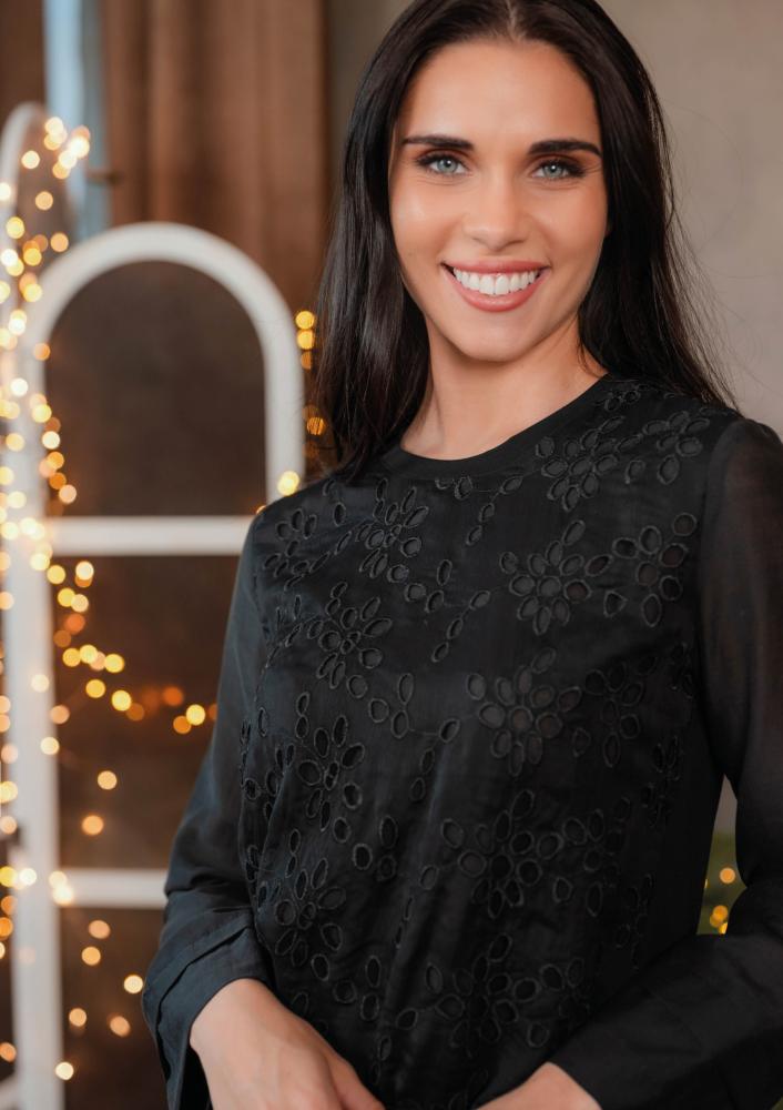 Black viscose Magenta top, loose fit, round neckline, lace trim at front. Film-printed Magenta branding at back.
