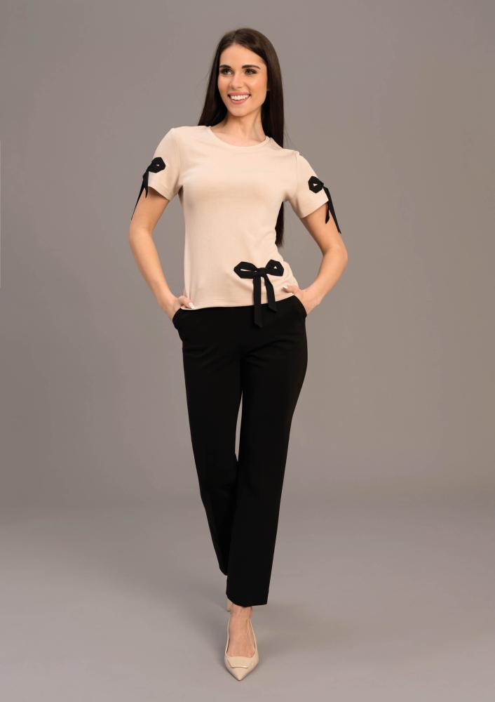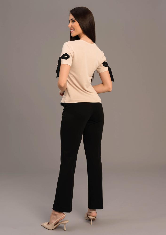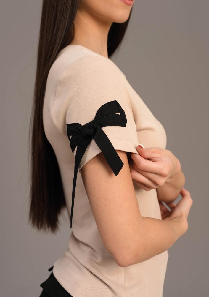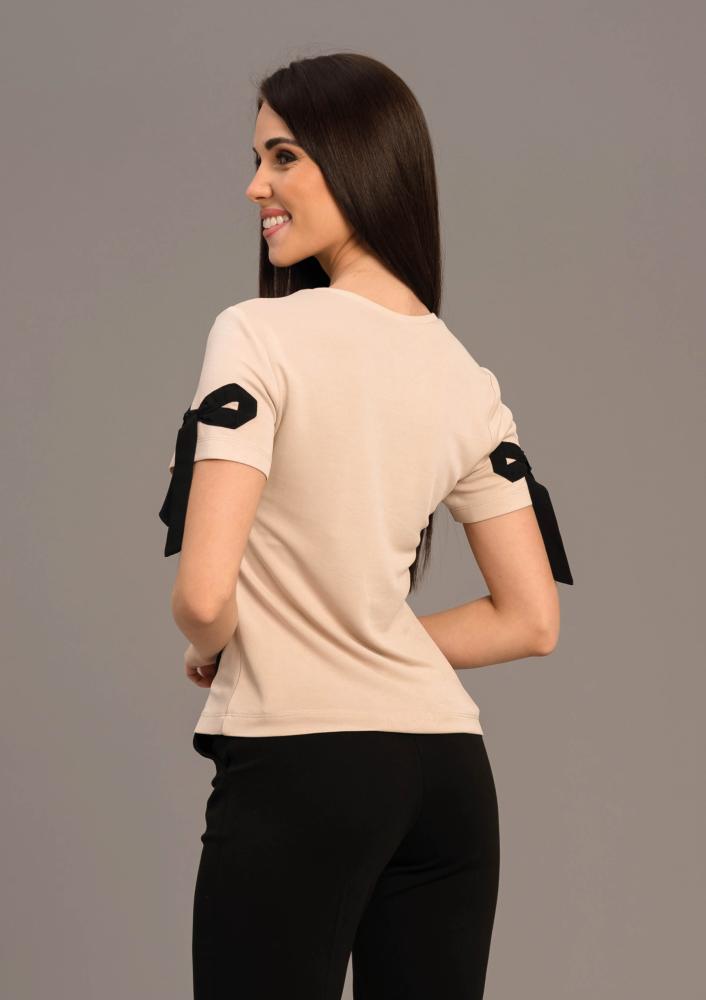 Beige, elastic viscose Magenta top, loose fit, round neckline, short sleeves, decorated with a bow at the front. Sewn-on textile Magenta branding on the side.