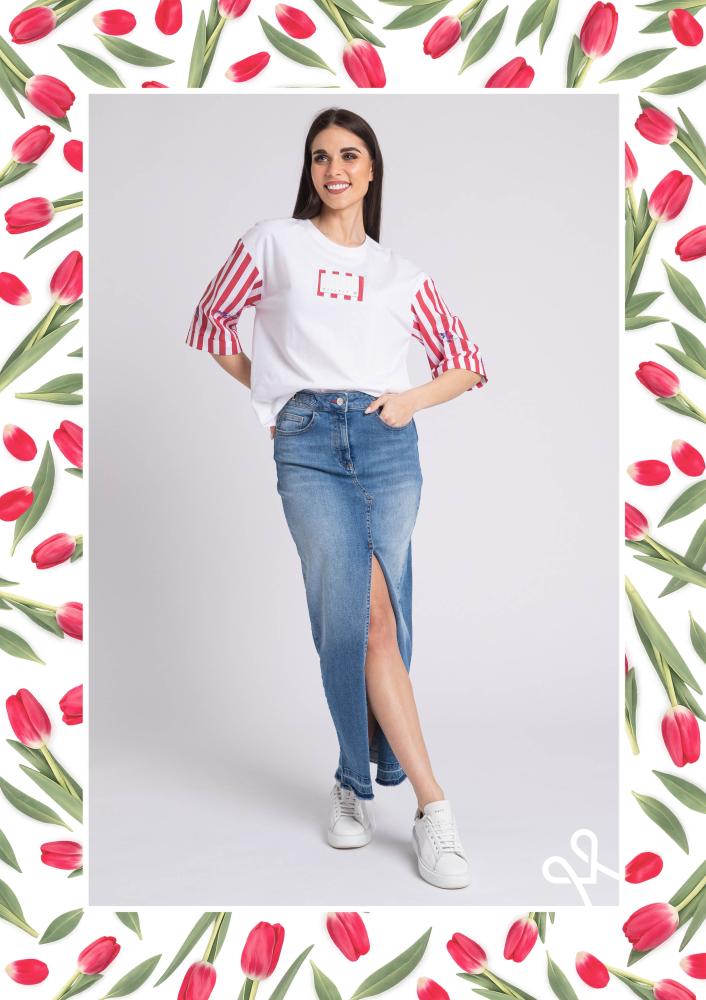 White Magenta top, loose fit, round neckline, short striped sleeves. Magenta branding sewn on the front.
