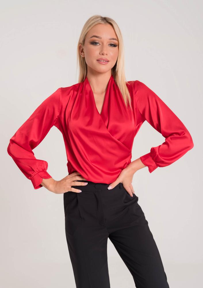 Piros színű, szatén Magenta felső, elegáns esésű, átlapolt fényes. Háta nyaki részén rávarrt textil Magenta felső.