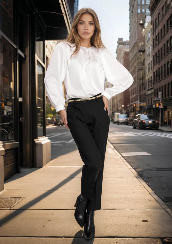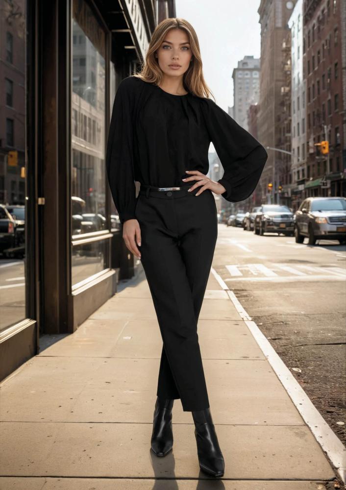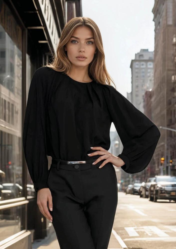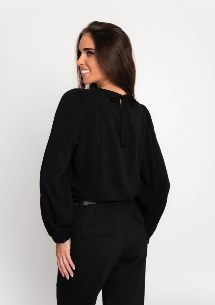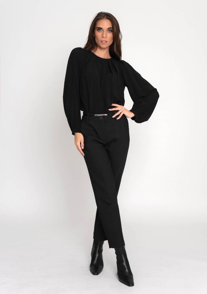 Fekete színű, kevert szálas muszlin Magenta blúz, laza fazonú, elején hajtásokkal díszített. Oldalán rávarrt textil Magenta márkajelzés.