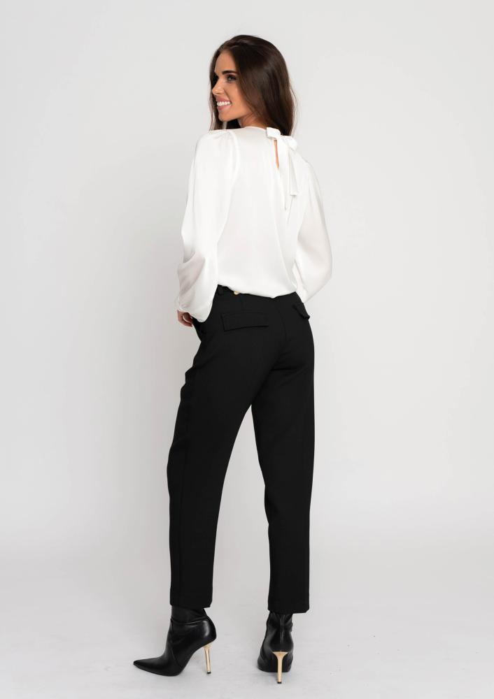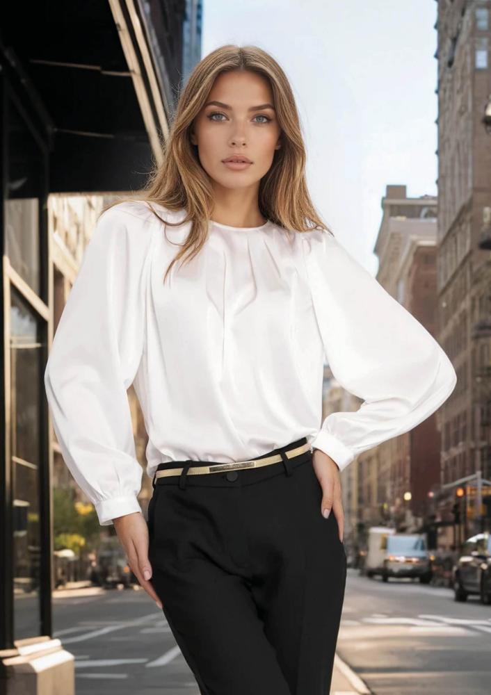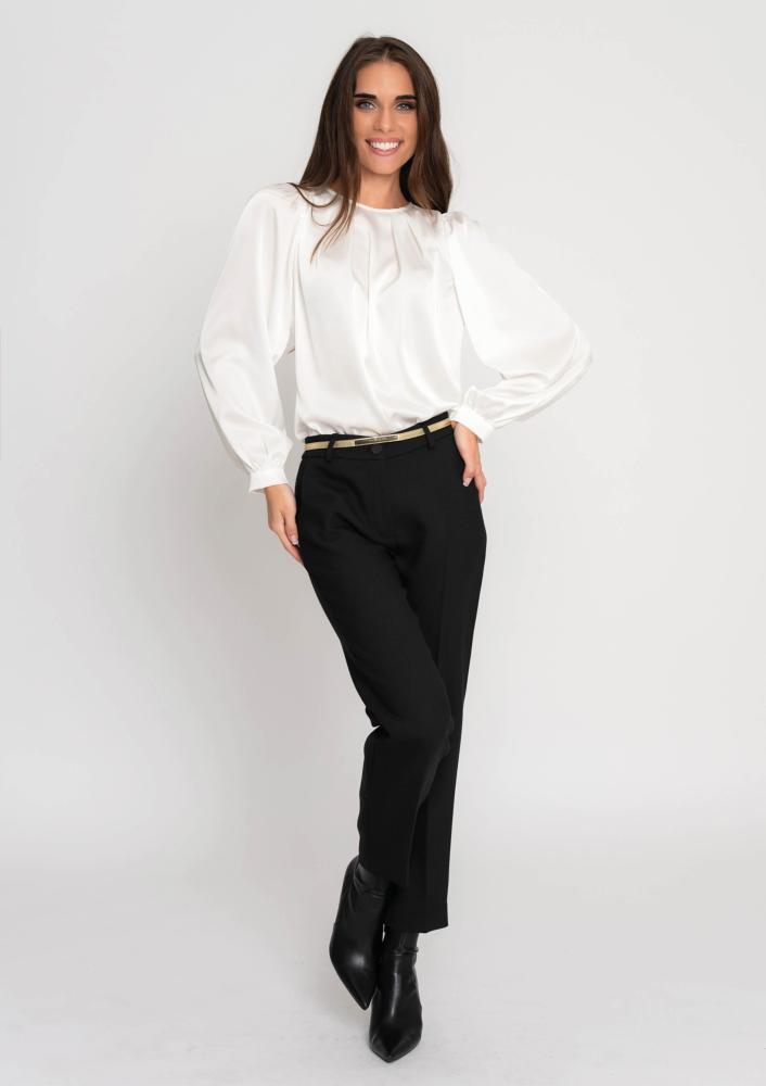 Vaj színű, kevert szálas szatén Magenta blúz, laza fazonú, elején hajtásokkal díszített, hátán megkötővel. Oldalán rávarrt textil Magenta márkajelzés.