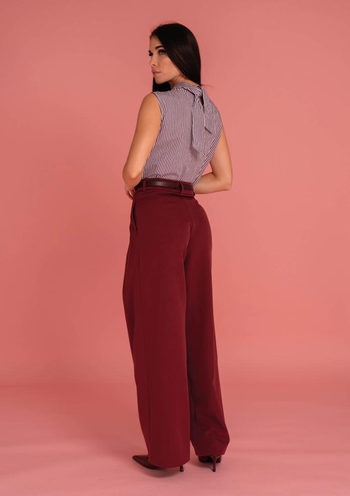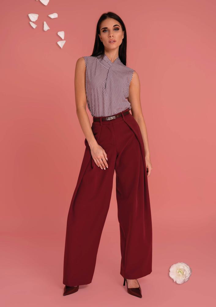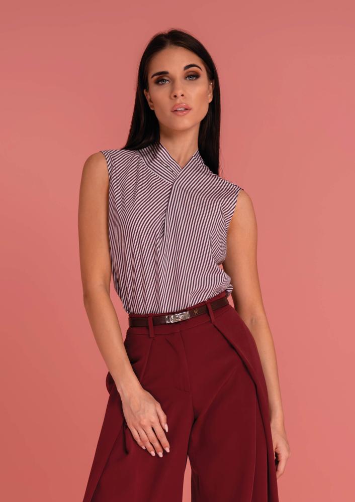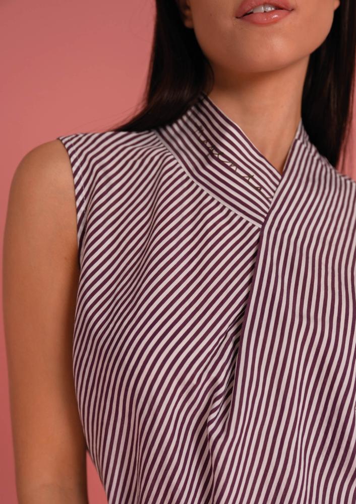 Csíkos, Magenta blúz, laza fazonú, ujjatlan, elején hajtással, hátán megkötővel. Oldalán rávarrt textil Magenta márkajelzés.