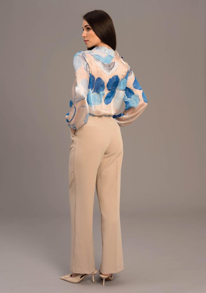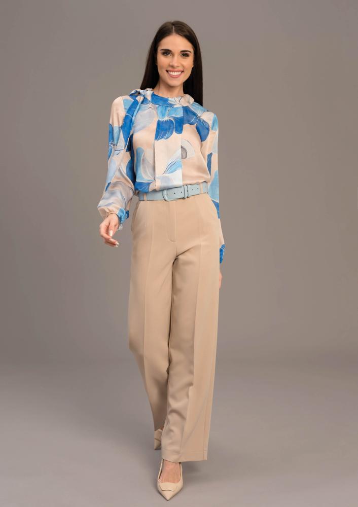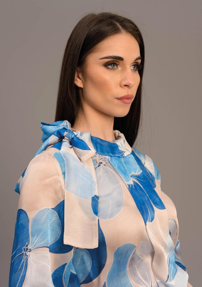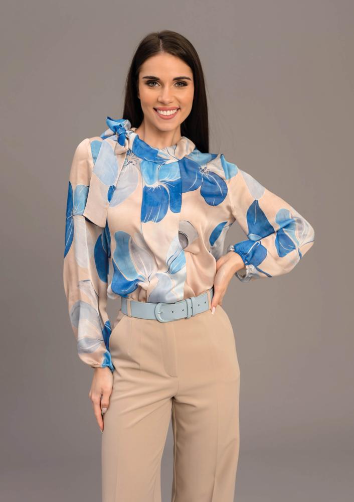 Mintás, kevert szálas Magenta blúz, laza fazonú, hosszú ujjal, magas nyakrésszel, megkötővel. Oldalán rávarrt textil Magenta márkajelzés.
