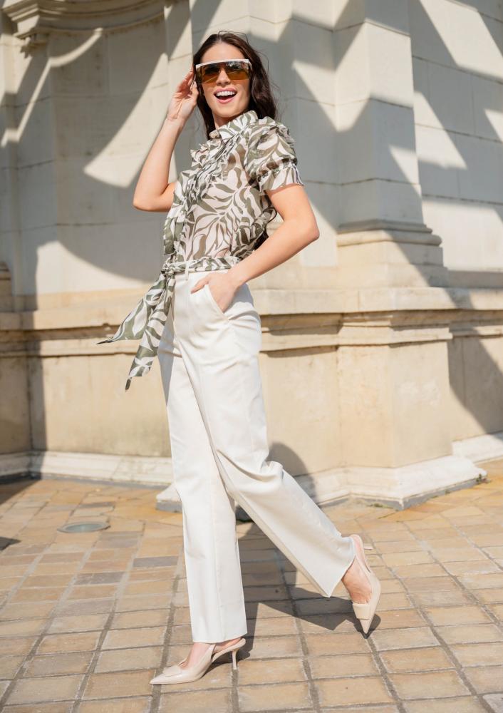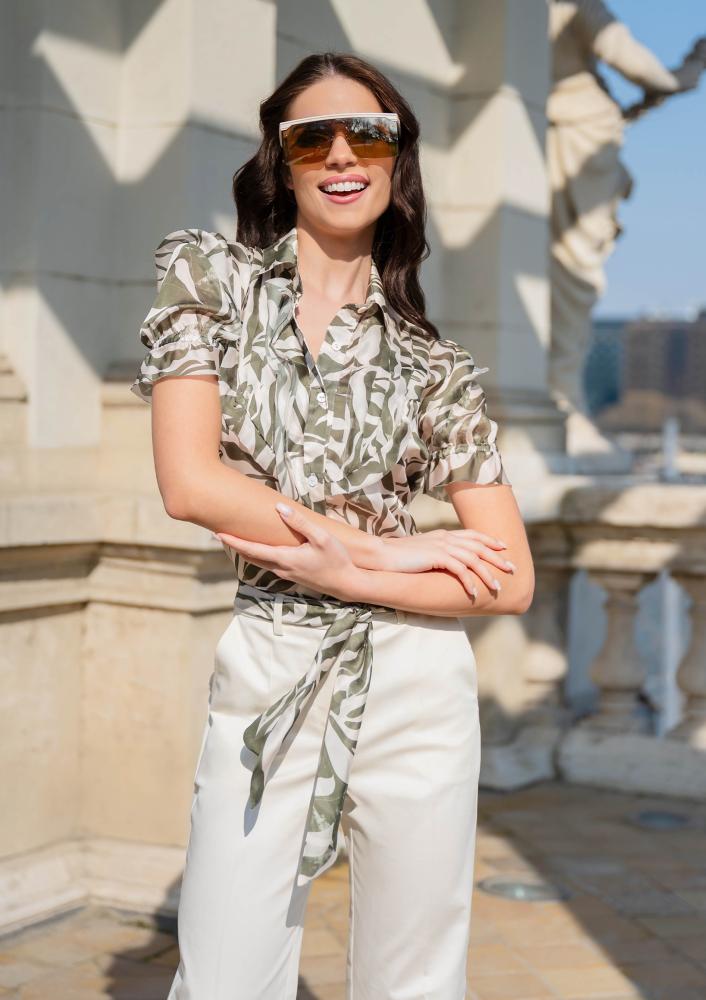 Mintás, Magenta blúz, lágy esésű, alakot követő, elején gombos záródással, rövid ujjal és fodor díszítéssel. Oldalán rávarrt textil Magenta márkajelzés.