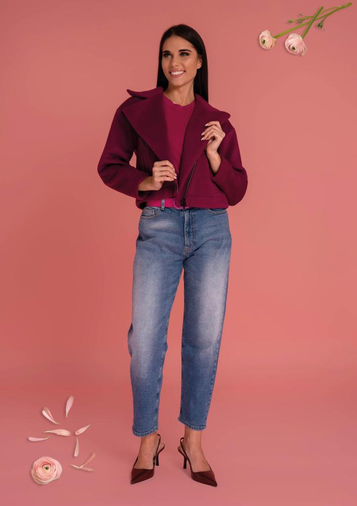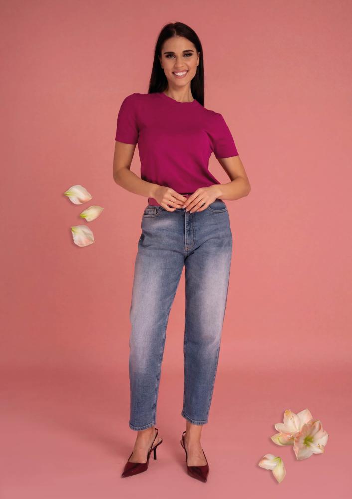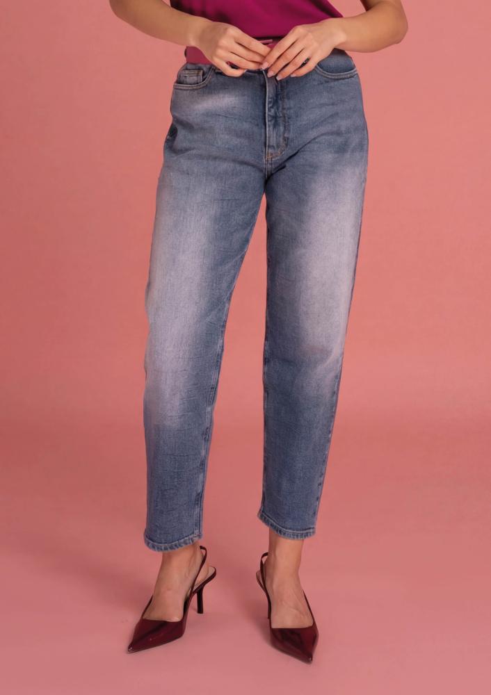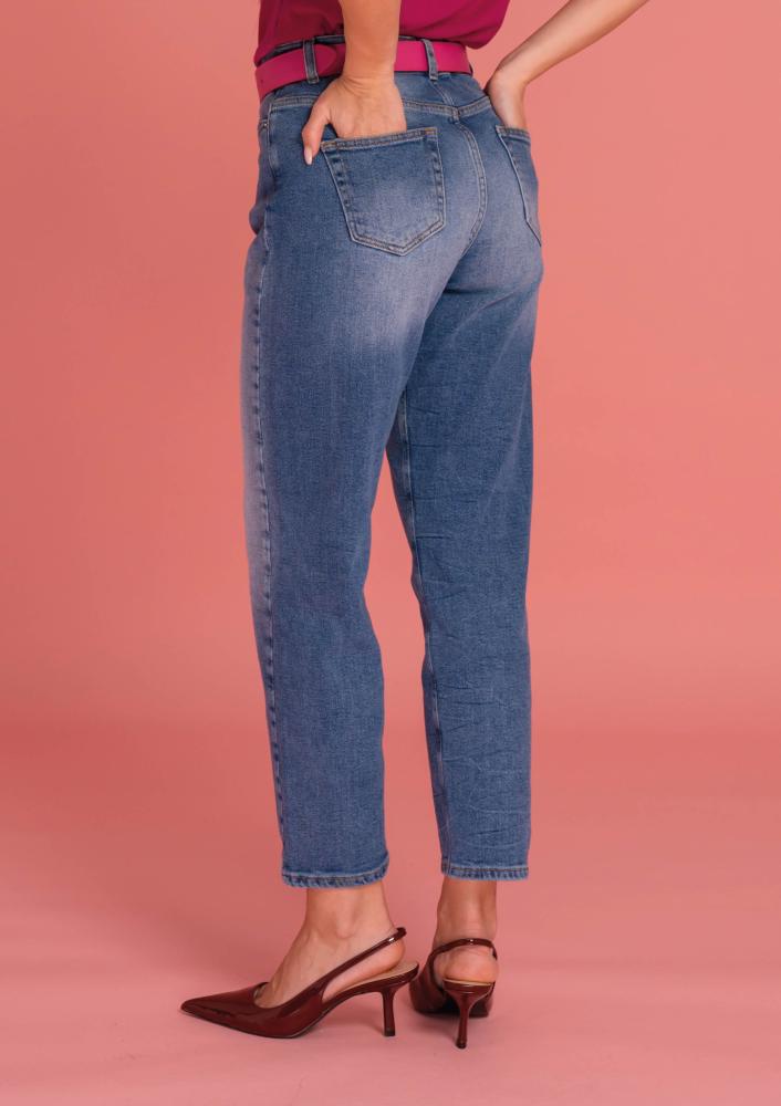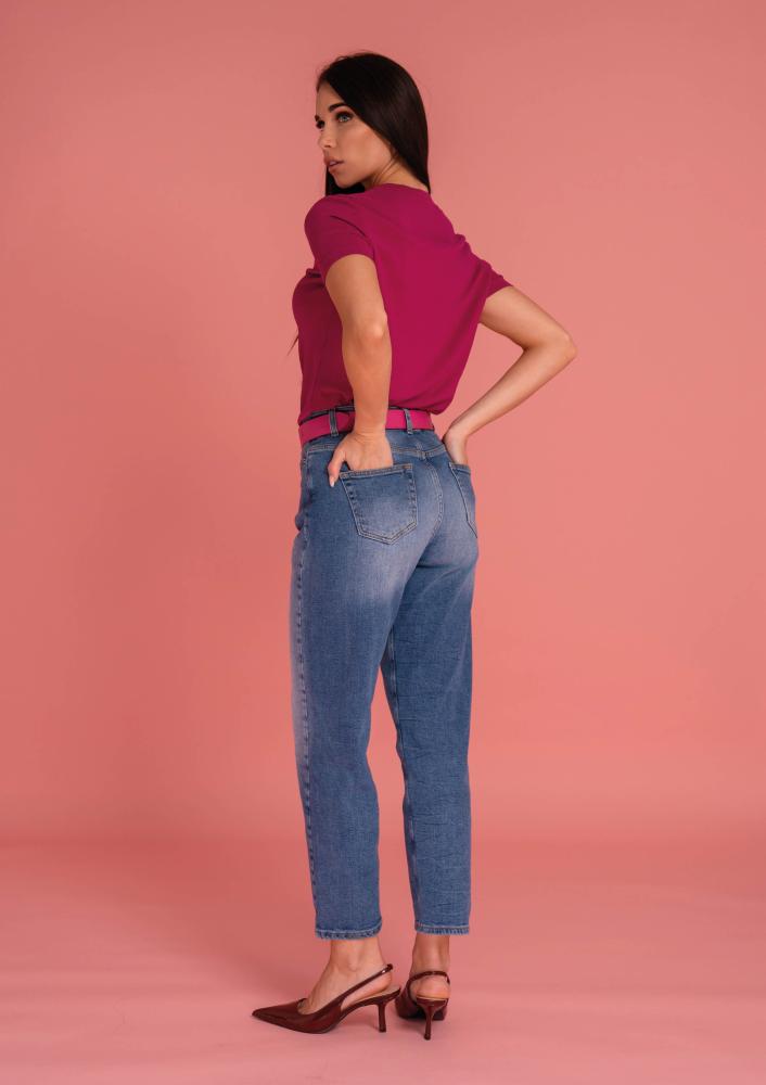 Kék színű, enyhén elasztikus pamut Magenta farmer nadrág, szűkülő szárú, zsebekkel, elején gombos és zippzáras záródással, övbújtatós derékrésszel.