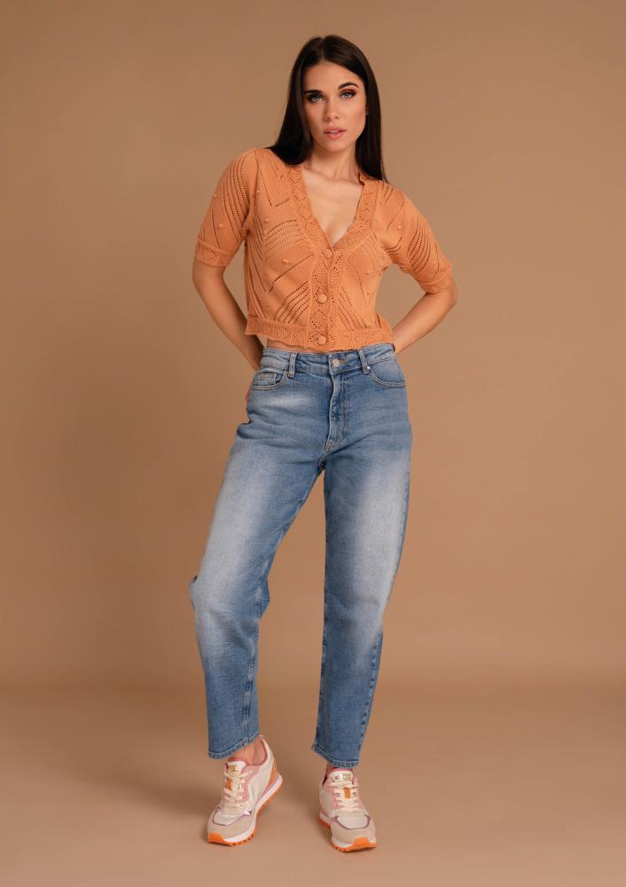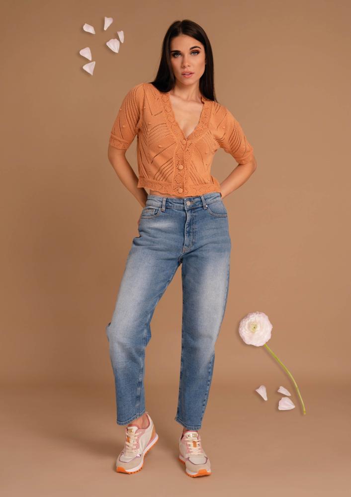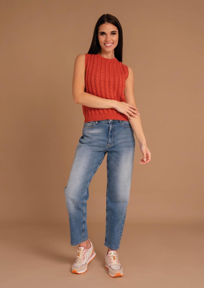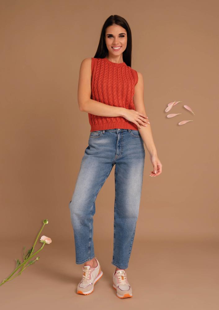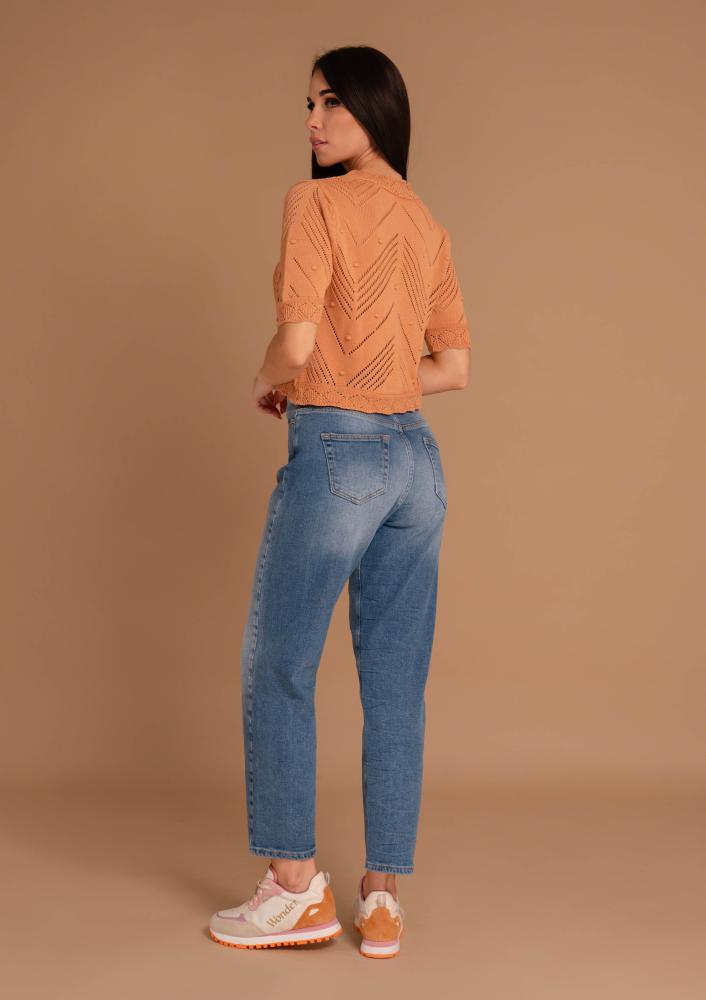 Kék színű, enyhén elasztikus pamut Magenta farmer nadrág, szűkülő szárú, zsebekkel, elején gombos és zippzáras záródással, övbújtatós derékrésszel.