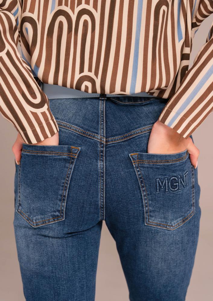 Kék színű, pamut Magenta farmer nadrág, szűkülő szárú, elején gombos és zippzáras záródással, övbújtatós derékrésszel, zsebekkel.
