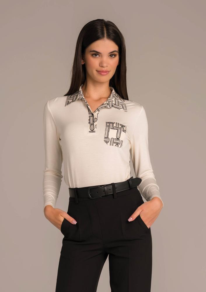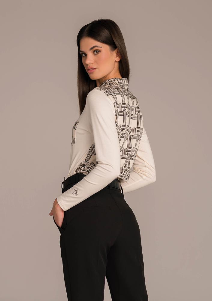Vaj színű, hátul mintás, elasztikus viszkóz Magenta felső, szűk fazonú, elején zseb díszítéssel. Oldalán rávarrt textil Magenta márkajelzés.