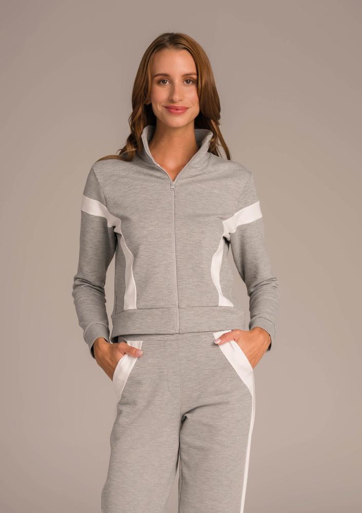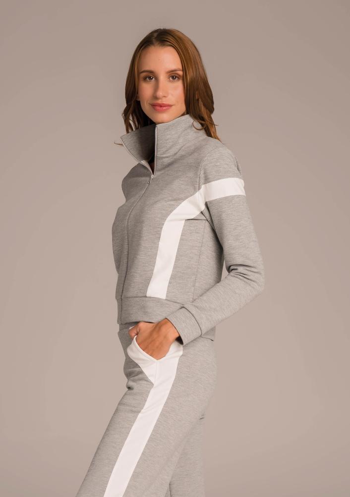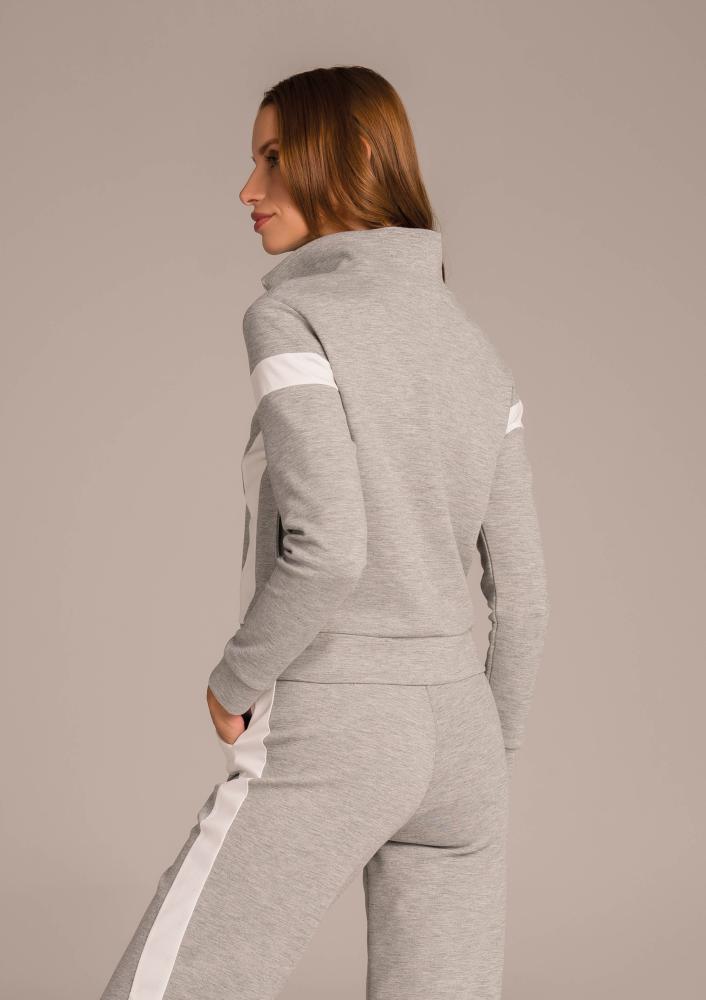 Szürke színű, elasztikus Magenta felső, laza fazonú, elején zippzáras záródással, zsebekkel. Hátul filmnyomott Magenta márkajelzés.