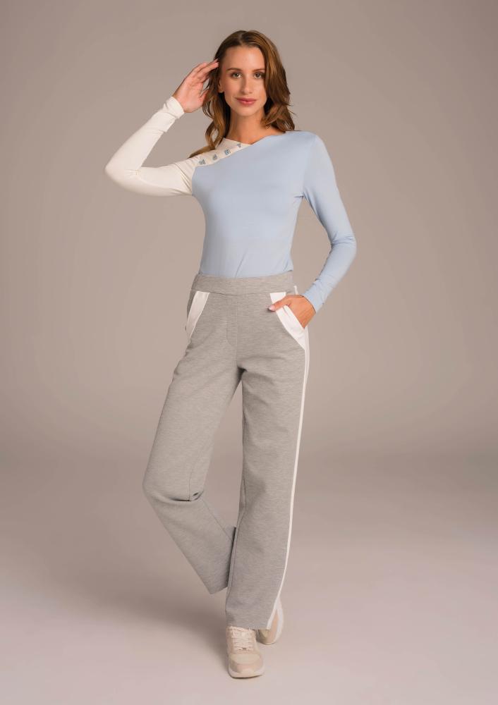 Világoskék színű, elasztikus viszkóz Magenta felső, szűk fazonú, enyhe V-nyakkivágással. Elején filmnyomott Magenta márkajelzés.