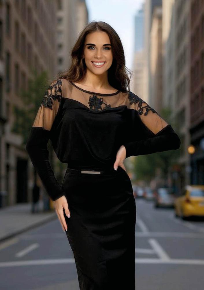 Fekete színű, tüll viszkóz Magenta felső, laza fazonú, csipke beépítéssel, kerek nyakkivágással. Oldalán rávarrt textil Magenta márkajelzés.