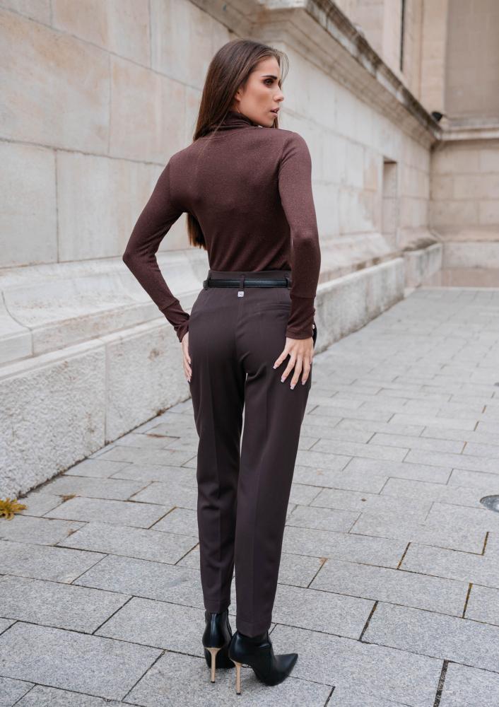 Barna színű, elasztikus Magenta felső, szűk fazonú, garbós nyakrésszel, ujja alján passzéval és díszgombokkal díszítve. Oldalán rávarrt textil Magenta márkajelzés.
