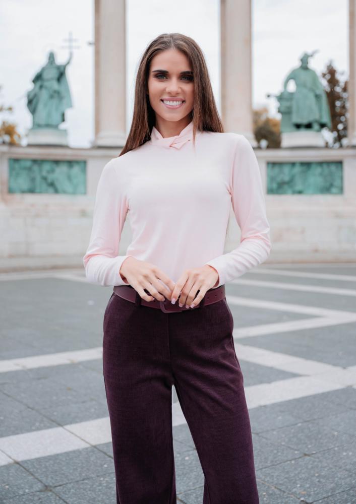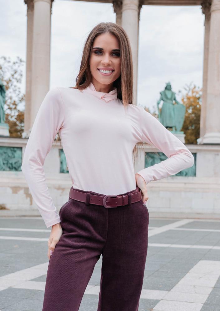 Púder színű, elasztikus viszkóz Magenta felső, szűkebb fazonú, magas álló gallérral és csavart résszel. Oldalán rávarrt textil Magenta márkajelzés.