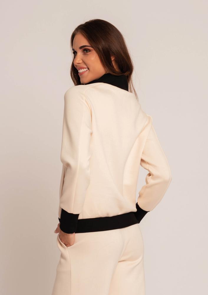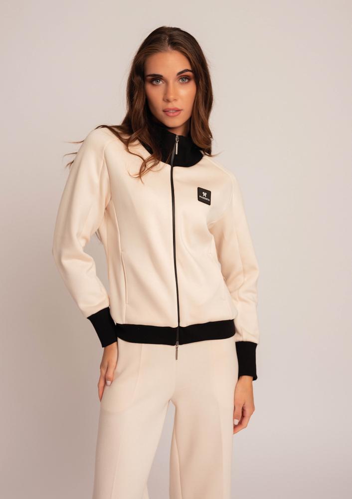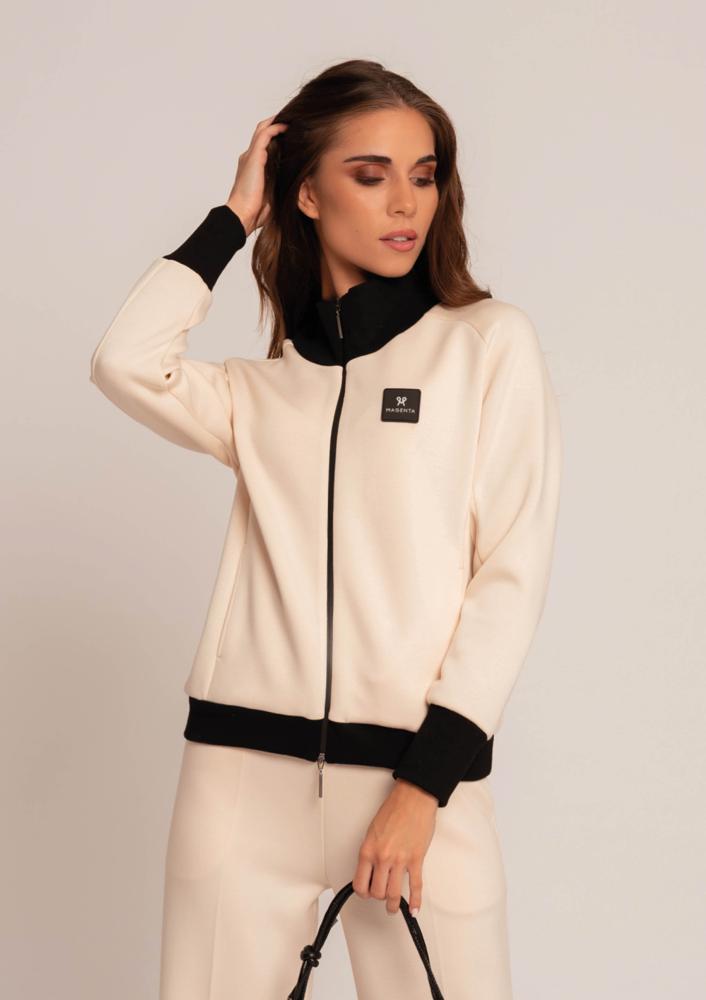 Vaj színű, Magenta felső, laza fazonú, fekete passzé beépítéssel, oldalán zsebekkel, elején zippzáras záródással. Elején rávarrt textil Magenta márkajelzés.