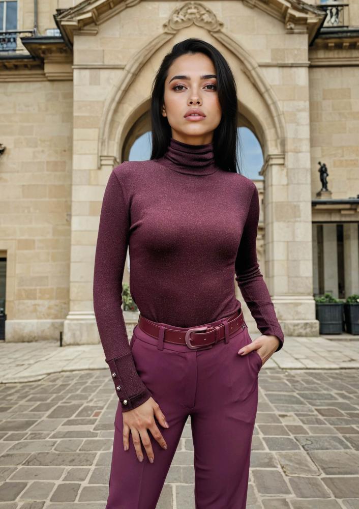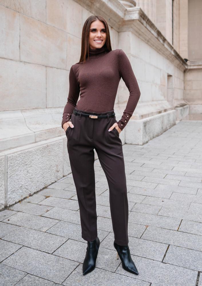 Bordó színű, elasztikus Magenta felső, szűk fazonú, garbós nyakrésszel, ujja alján passzéval és díszgombokkal díszítve. Oldalán rávarrt textil Magenta márkajelzés.
