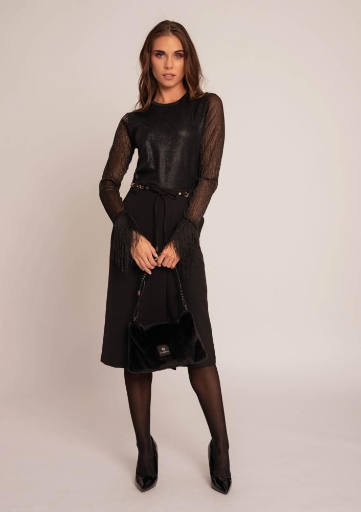 Fekete színű, kevert szálas Magenta ruha, szűkebb fazonú, kerek nyakkivágással, ujja alján rojtos megoldással. Oldalán rávarrt textil Magenta márkajelzés.