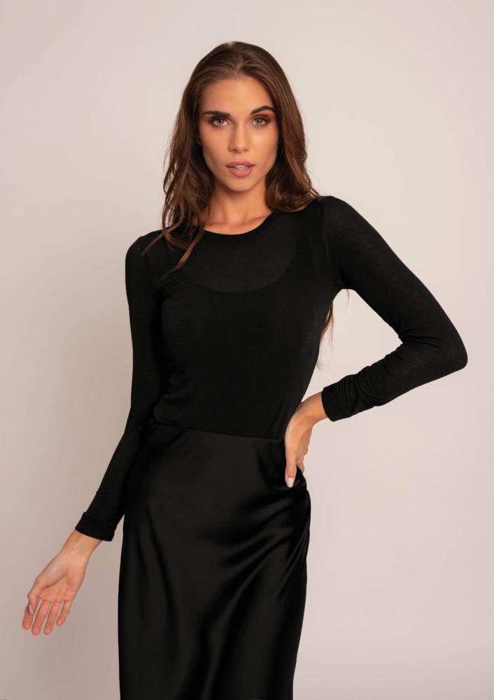 Fekete színű, elasztikus, vékony kötésű Magenta felső, szűk fazonú, hosszú ujjú, kerek nyakkivágással. Oldalán rávarrt textil Magenta márkajelzés.