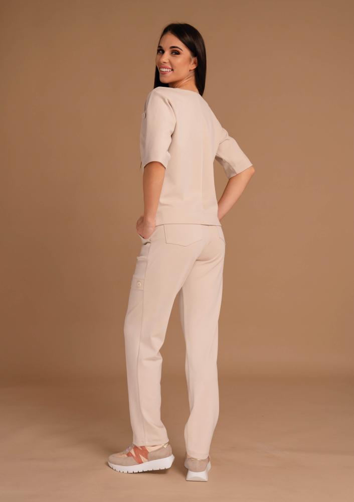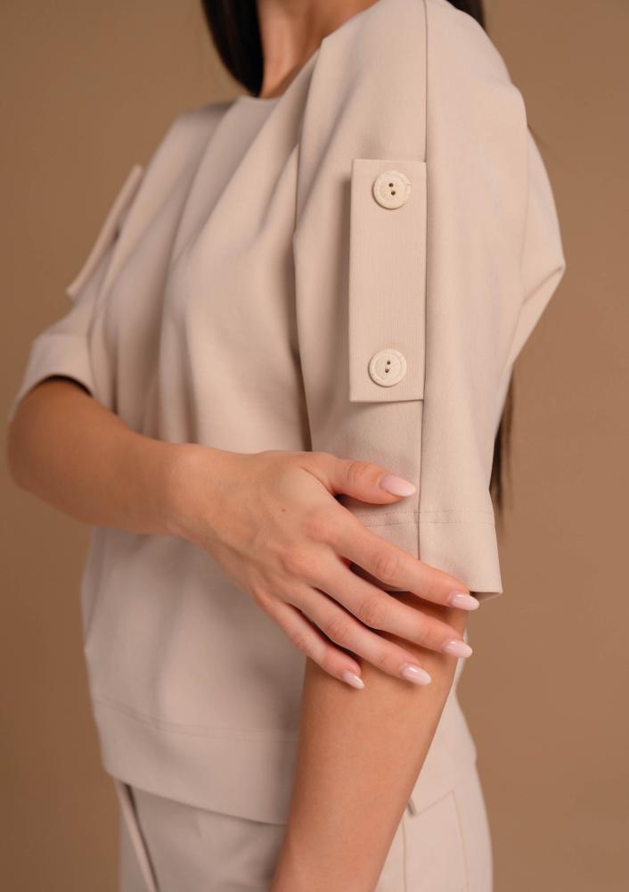 Vaj színű, kevert szálas Magenta felső, laza fazonú, 3/4 ujjhosszal. Oldalán rávarrt textil Magenta márkajelzés.