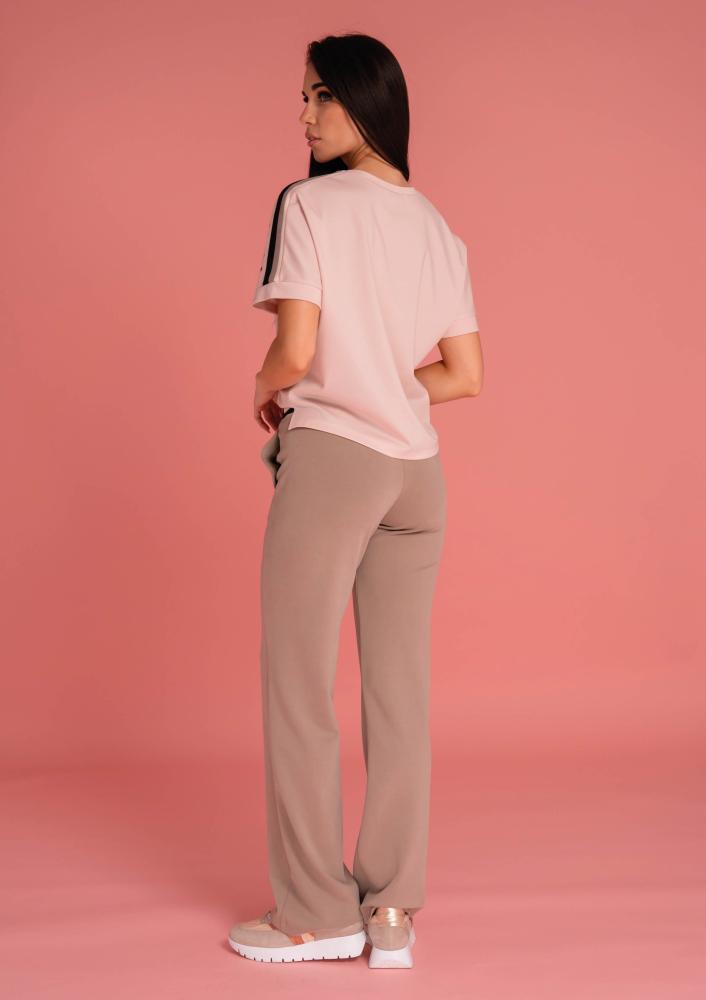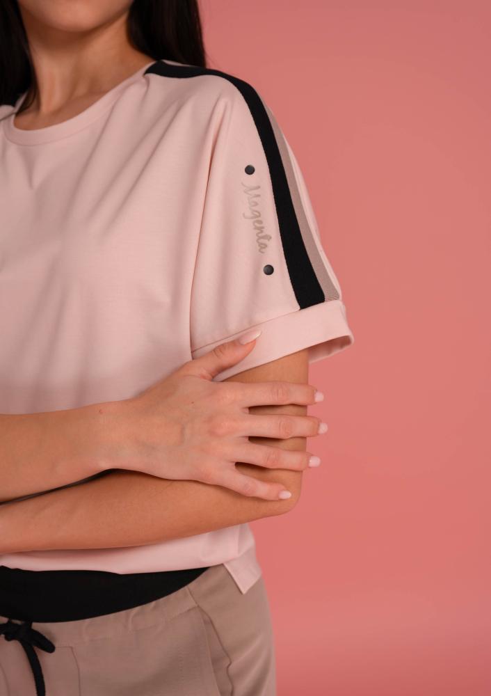 Púder színű, pamut Magenta felső, laza fazonú, kerek nyakkivágással, váll részén beépített passzéval. Ujján filmnyomott Magenta márkajelzés.