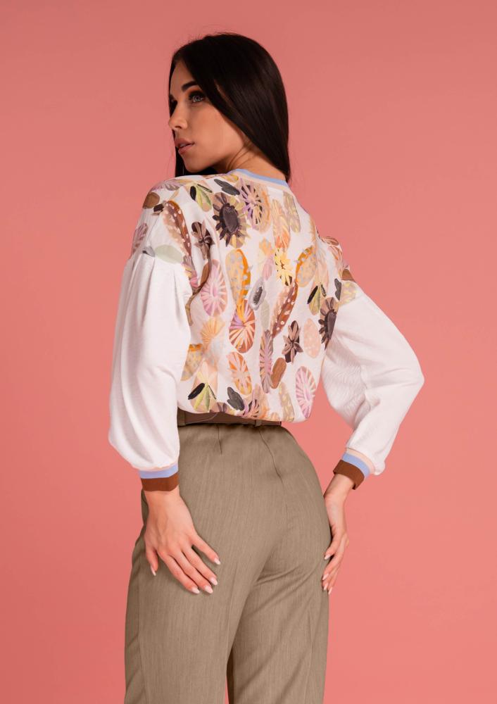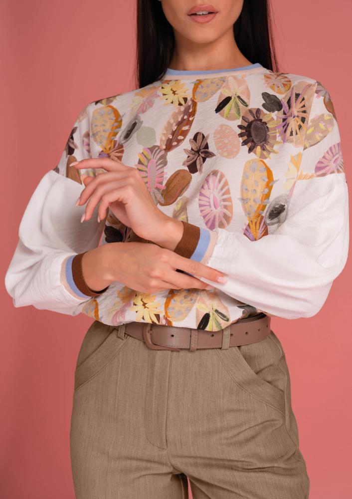 Mintás, Magenta felső, laza fazonú, kerek nyakkivágással, hosszú ujjal, elején és hátán nyomott mintával, ujján passzéval. Oldalán rávarrt textil Magenta márkajelzés.