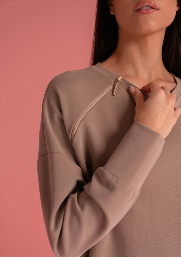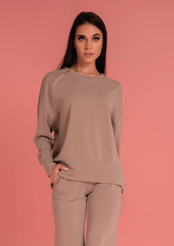 Barna színű, Magenta felső, laza fazonú, oldalán hasítékkal, nyakánál zippzárral díszített filmnyomással.