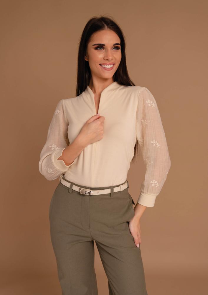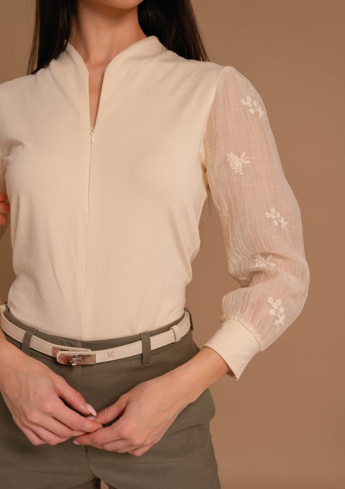Púder színű, viszkóz Magenta felső, szűkebb fazonú, elején zippzáras záródással, ujja csipke díszítéssel. Oldalán rávarrt textil Magenta márkajelzés.