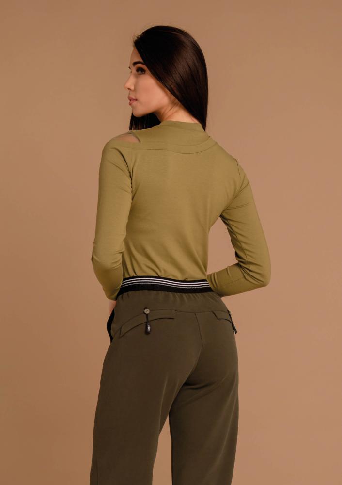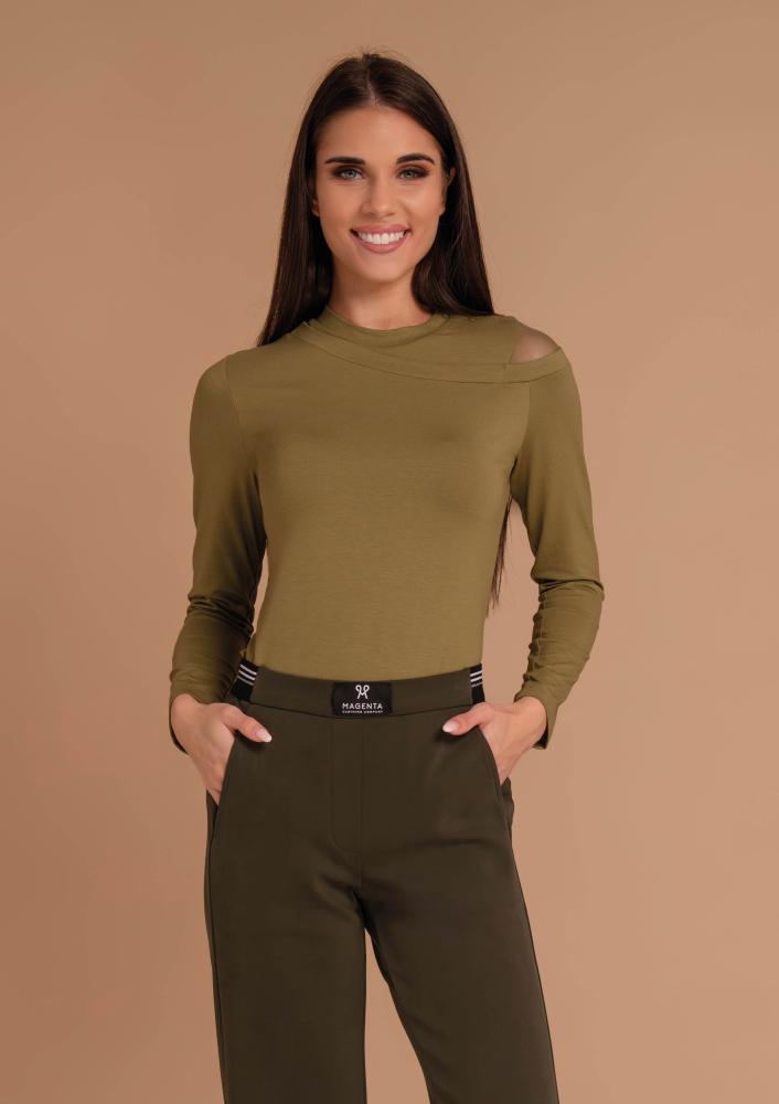 Zöld színű, elasztikus Magenta felső, szűk fazonú, magas nyakrésszel, vállrészén tüll beépítéssel. Ujján filmnyomott Magenta márkajelzés.