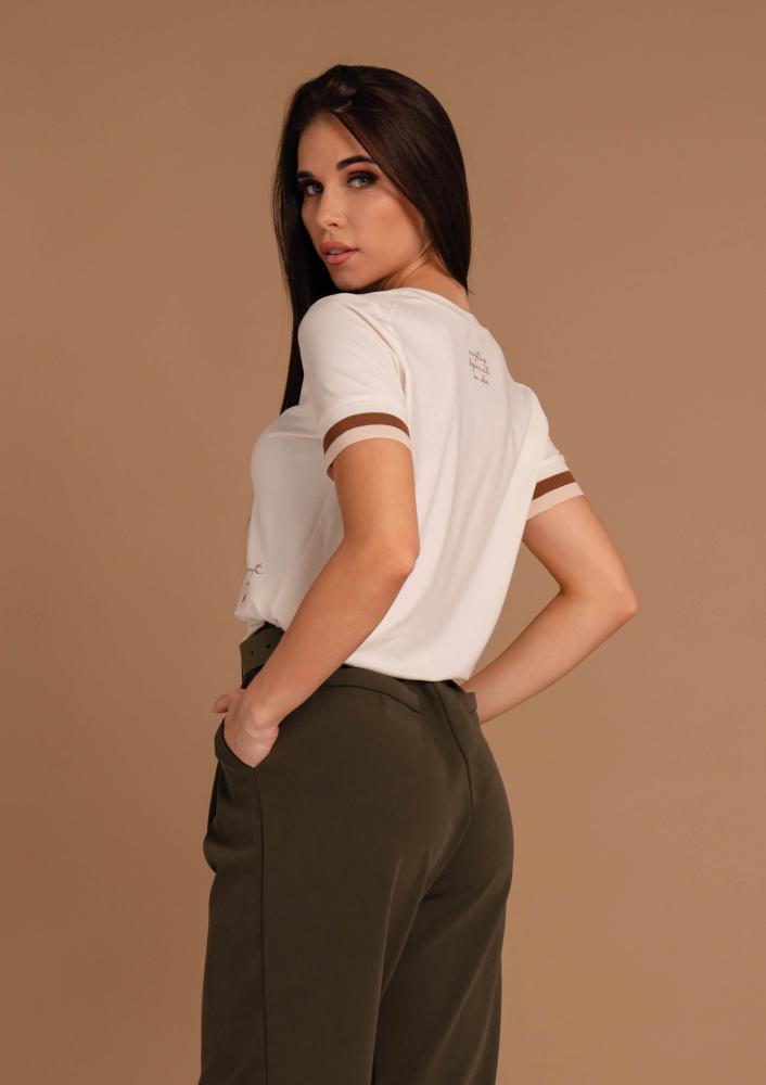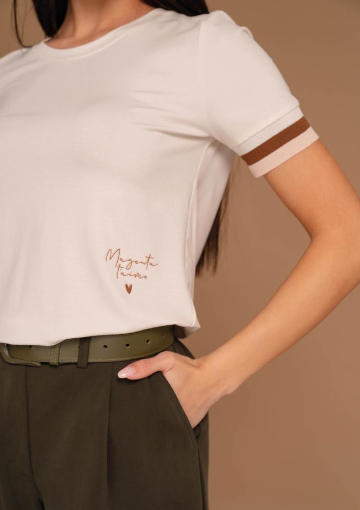 Vaj színű, viszkóz Magenta felső, laza fazonú, kerek nyakkivágással, ujján passzéval. Elején hímzett Magenta márkajelzés.