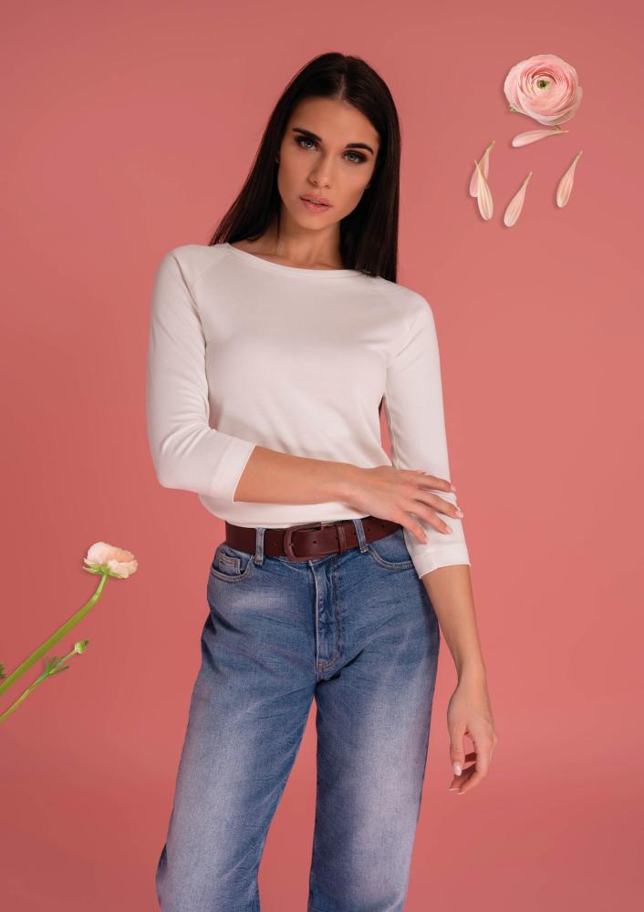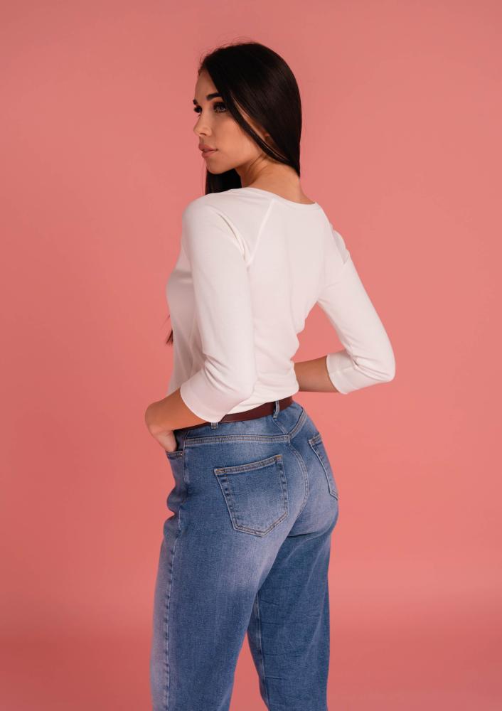 Vaj színű, Magenta felső, laza fazonú, 3/4 ujjal, kerek nyakkivágással. Oldalán rávarrt textil Magenta márkajelzés.